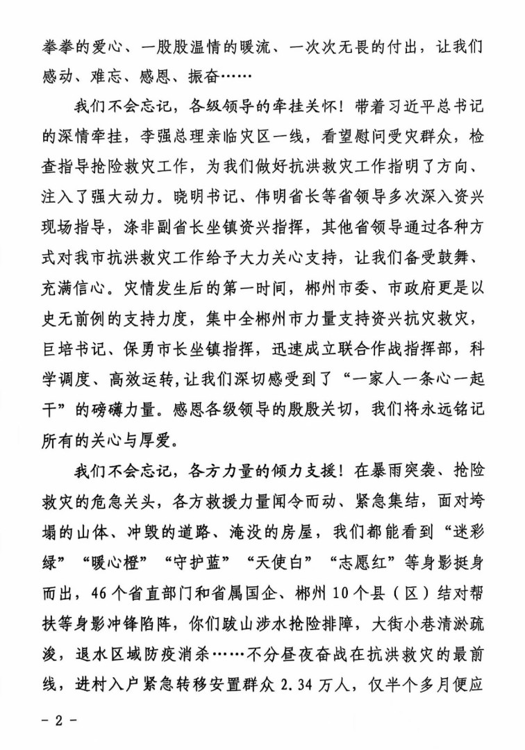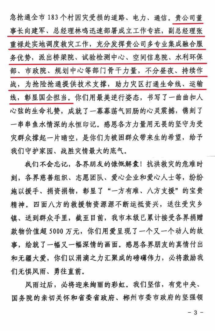 信中指出,資興市此次遭遇災(zāi)情極為罕見,多地基礎(chǔ)設(shè)施遭到嚴重損毀、大范圍交通中斷,當?shù)厝嗣?/span>生產(chǎn)生活遭受嚴重影響。在關(guān)鍵時刻,湖南交通設(shè)計院黨委高度重視、響應(yīng)號召、極速支援,在黨委書記、董事長向建軍,黨委副書記、副董事長、總經(jīng)理林鳴的部署下,迅速成立救災(zāi)重建工作專班,派出司屬橋梁院、試驗檢測中心、空間信息院、水利環(huán)保部、市政院、規(guī)劃中心、市場中心等單位包括教授級高工在內(nèi)的技術(shù)骨干力量,抽調(diào)設(shè)備物資,全力投入。黨委委員、副總經(jīng)理張重祿赴一線實地調(diào)度,黨委委員、副總經(jīng)理、總工程師李瑜全過程督導。公司上下協(xié)同作戰(zhàn),以實際行動貢獻國企力量,彰顯國企擔當。