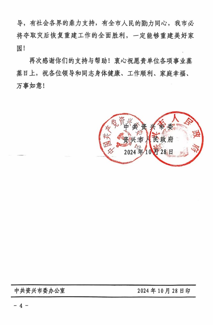 近日,中共資興市委、資興市人民政府發(fā)來感謝信,信中高度評價了湖南省交通規(guī)劃勘察設(shè)計院有限公司在馳援資興搶險救災(zāi)及災(zāi)后恢復重建工作中展現(xiàn)的擔當精神和技術(shù)水平,對公司作出的積極貢獻表達了誠摯的感謝。